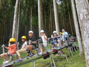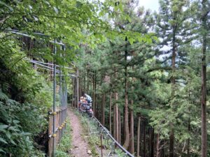行者の修練場の脇を抜けて、道沿いの鍾乳洞入口らしきところに着くと、なんとそこからは、モノレール?トロッコ?で鍾乳洞まで登って行くらしい。