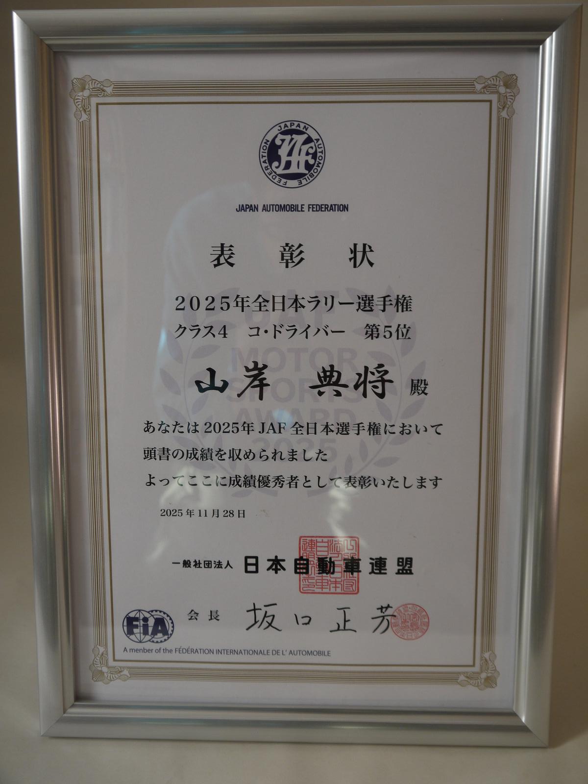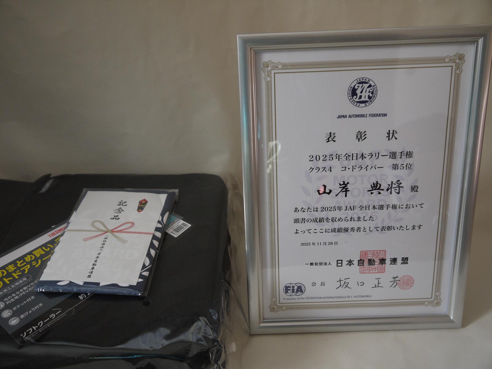 コ・ドライバーの表彰とかやめればいいのにと思っている私にはあまり意味のないものだけれど、まあ私も楽しくラリーができ、たぶん鶴岡さんがJN-4 5位になるのに貢献できたので、その記念にはなるかな。
